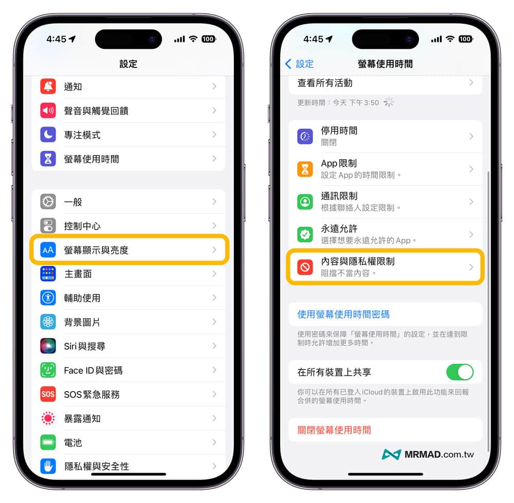- iOS 11 以下设定位置:「设置」>「屏幕显示与亮度」>「内容与隐私权限制」。