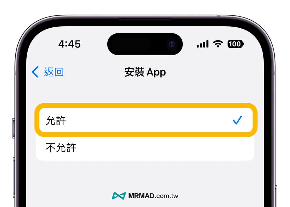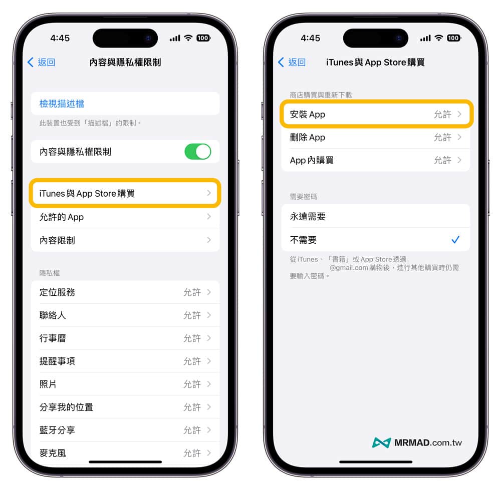 将 iTunes 与 App Store 安装 App 设置改成「允许」,不建议调整「不允许」避免 App Store 会无法安装下载 App。