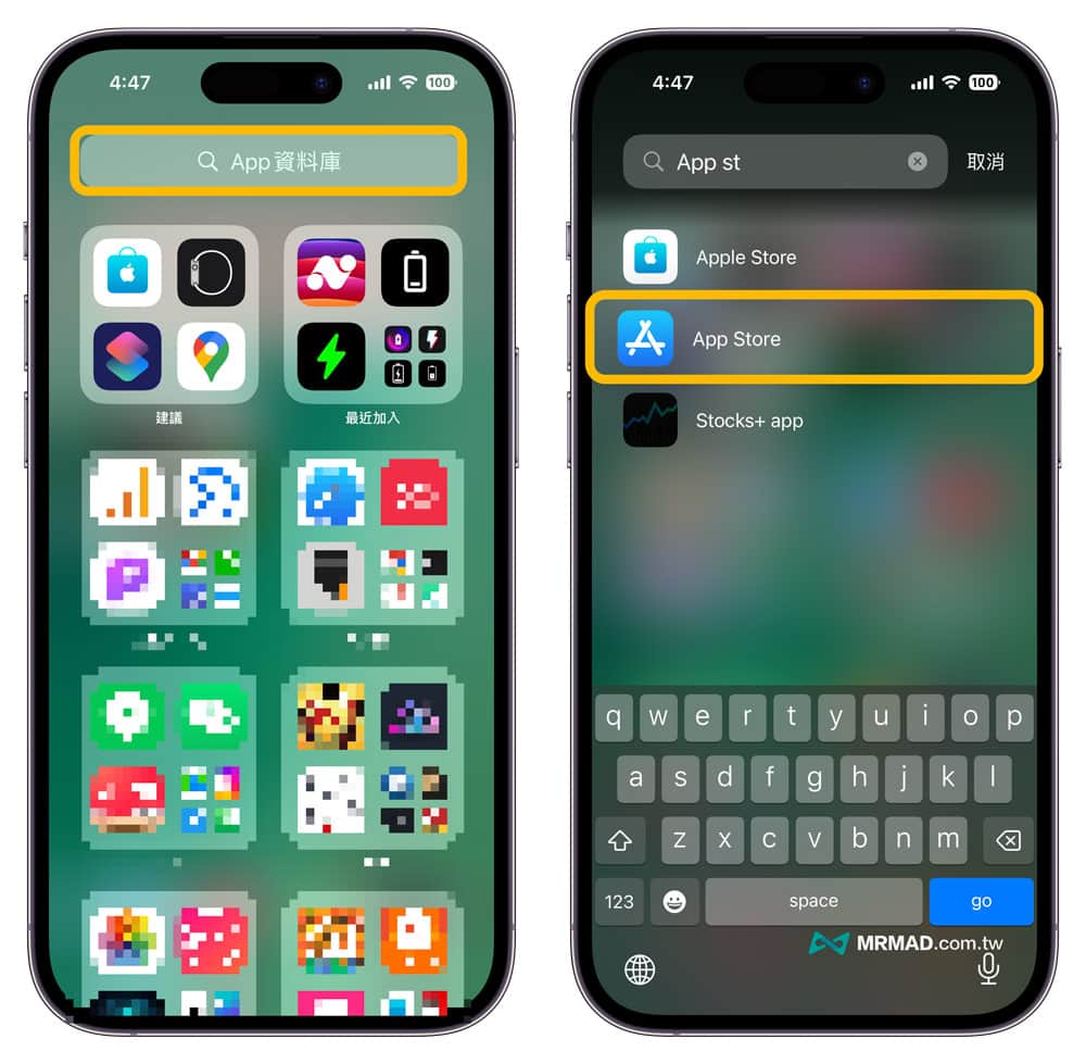 另外也可以滑到 iPhone 主画面最右侧页面,进入「App资料库」功能,同样透过搜寻也能找到「App Store」应用程式,找到后同样可以压着 App Store 图标不放,直接拉回 iPhone 主画面上,方便后续能够点选。