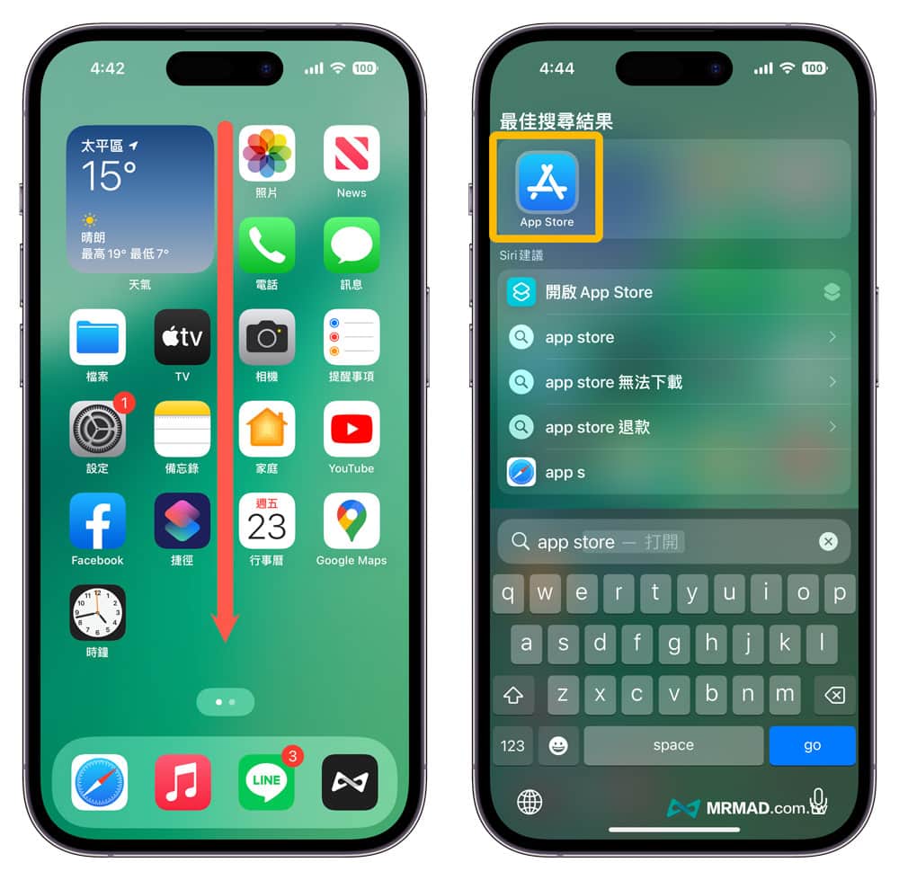 要是在 iPhone 桌面找不到 App Store 应用程式,直接利用 iOS 主画面下滑,透过「搜索」Spotlight 功能寻找「App Store」,就会出现在最佳搜索结果中。
