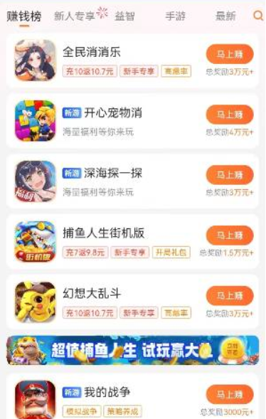 如下图所示就是秒单的首页截图。赚钱榜是大家玩的最多,总收益排名靠前的游戏,还有新人专享,益智,手游,最新等等,而且右边还有个放大镜图标,点进去以后,可以搜索大家想玩的类型游戏。
