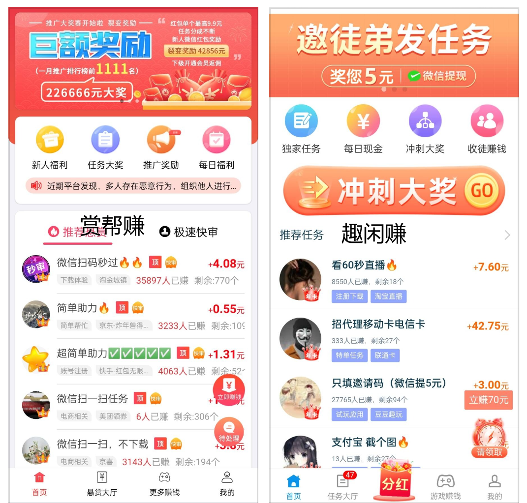 赏帮赚和趣闲赚都支持多级好友提成,首先是一级好友完成新手福利及提现赏帮赚奖励12元;趣闲赚是奖励11元,但趣闲赚有一个徒弟首发任务通过奖励5元的优势。其次一二级游戏试玩分成,赏帮是提30%,趣闲赚是27%,这一点上赏帮赚可以赚的多一点。